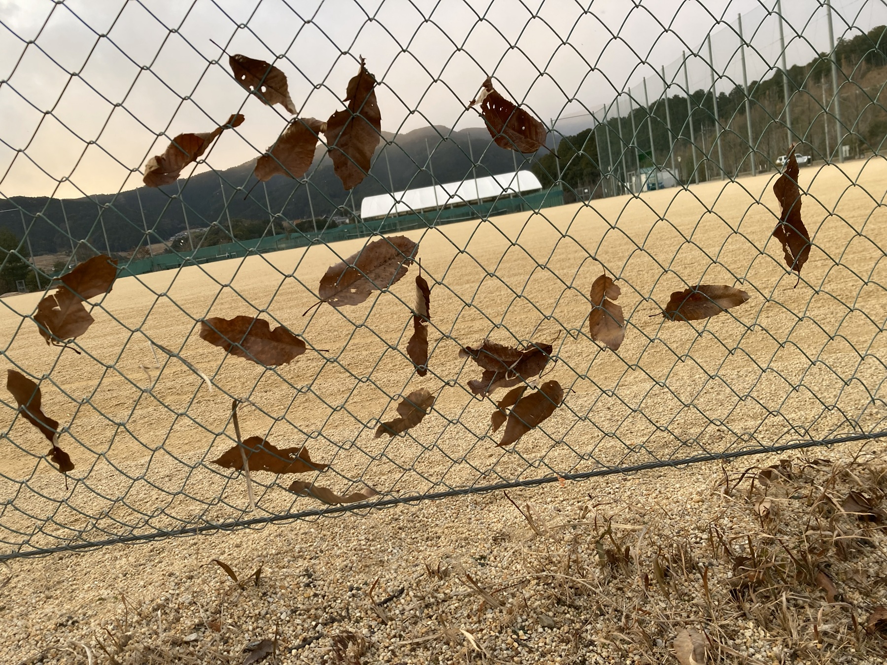 寒かったが運動公園まで歩いた。グランドの金網に風に吹き飛ばされてきた枯れ葉がひっついて落ちない。