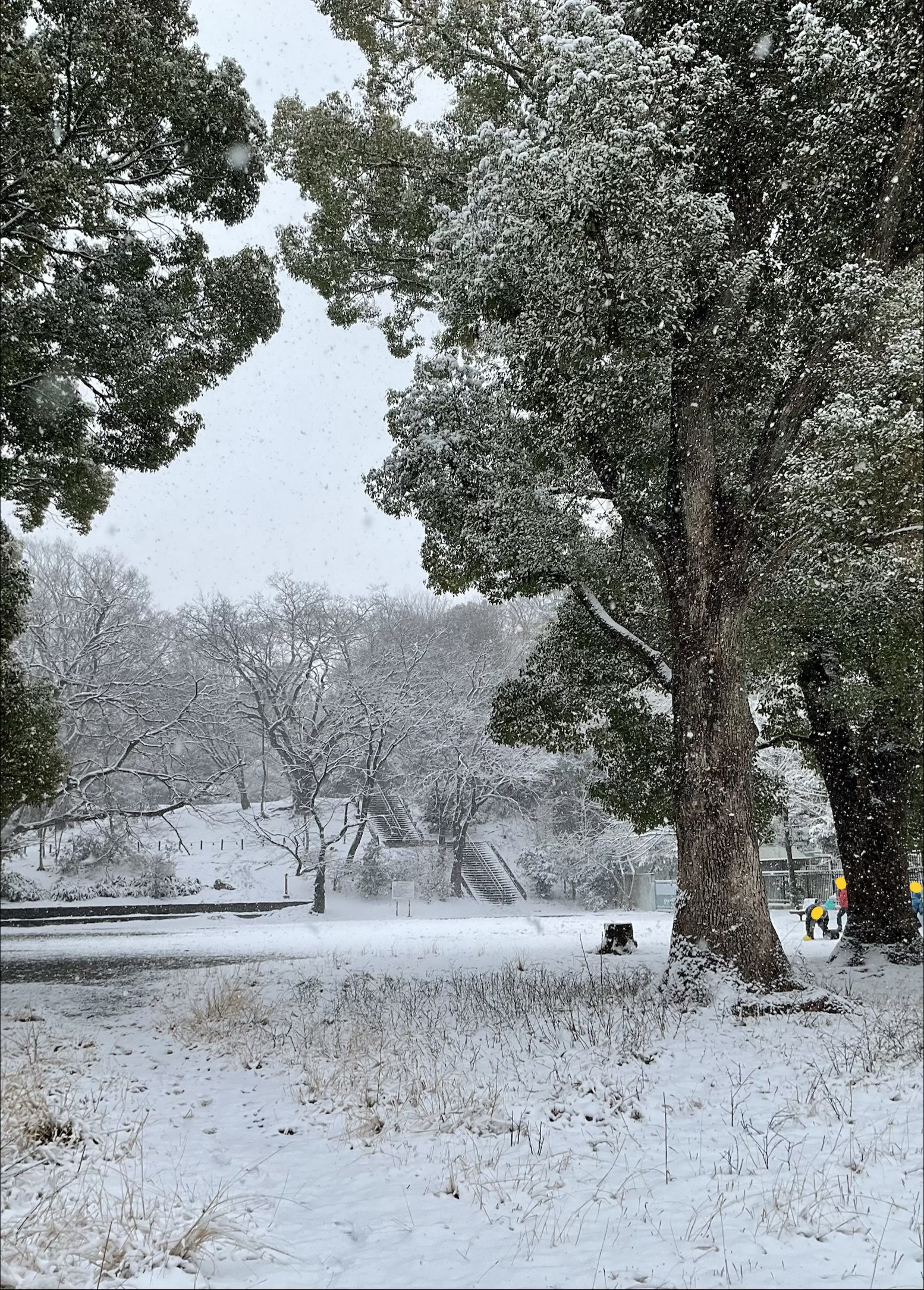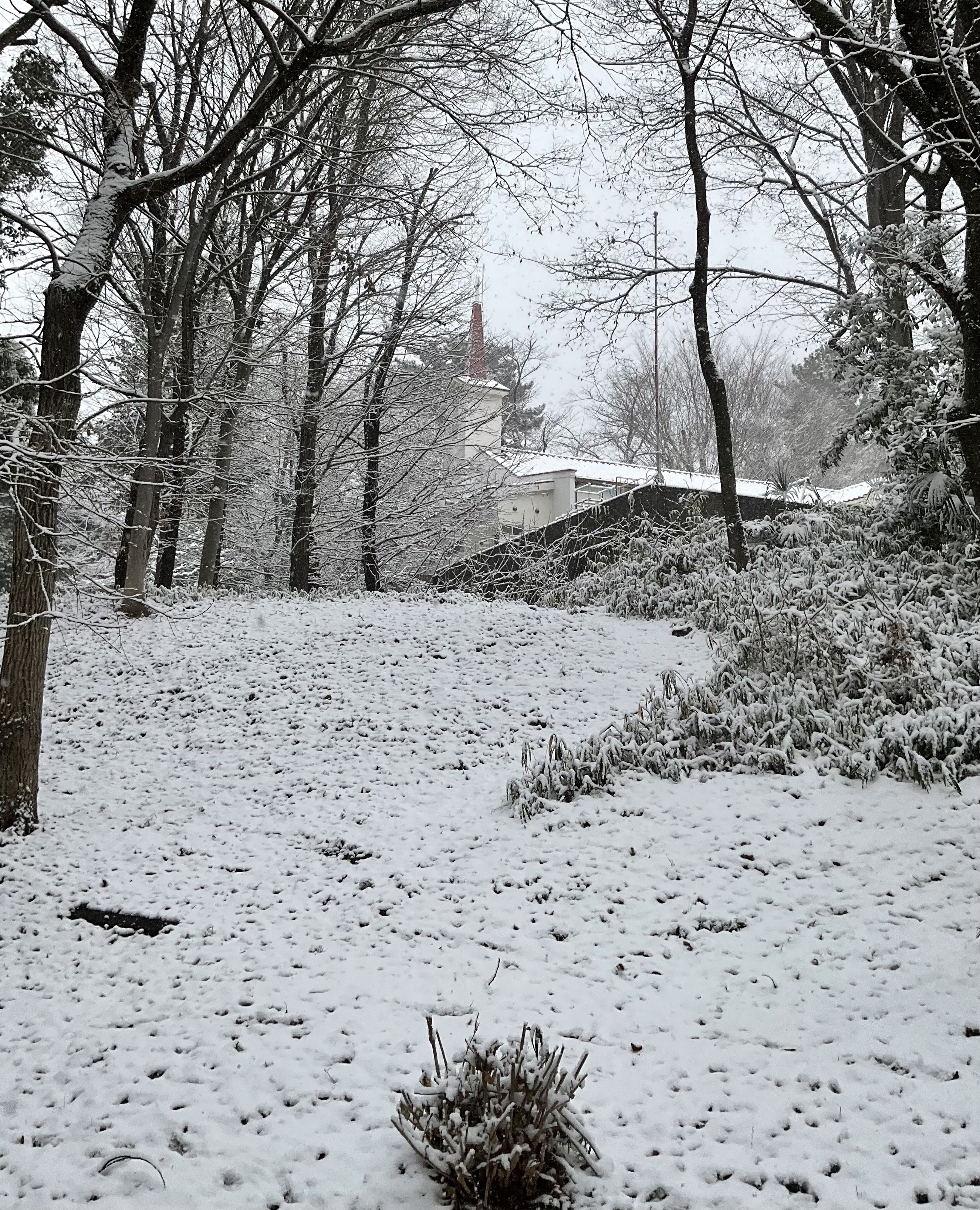 細かい雪で積もりそうと思った。案の定、激しく降り出した雪は積もり
