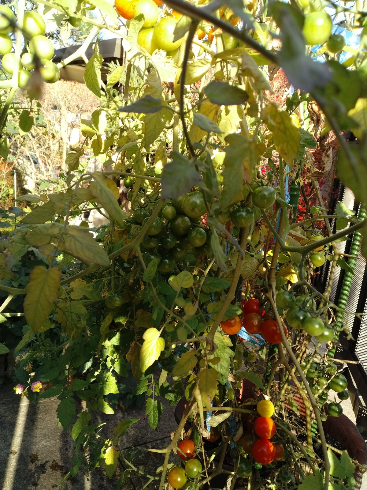 秋植えのミニトマトがだいぶ熟しています。皮がやや硬い。