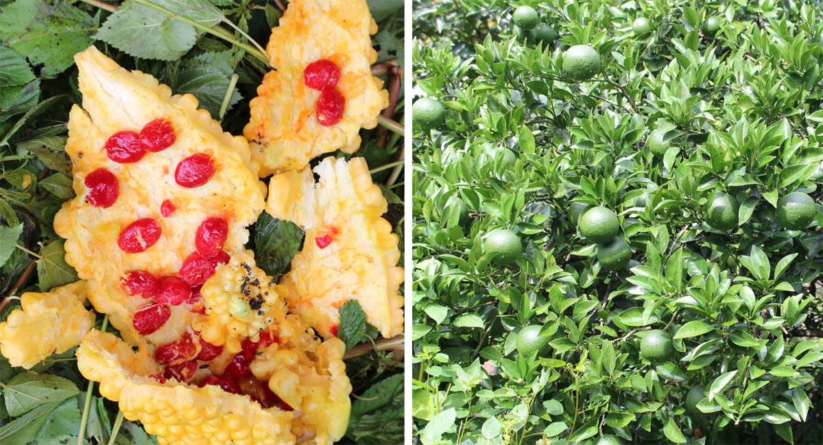 写真は草陰で爆発してしまっていたゴーヤと、今年は豊作年の夏ミカン