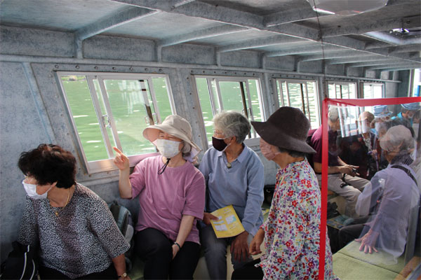 船長は60代くらいの年配の人だが、親切で、操舵を操りながら説明してくれる。