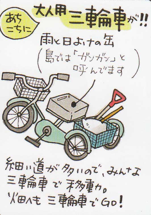 島は周囲約7キロで、道路はあっても一台も自動車は無く、島民の人たちは自転車(三輪)を利用して移動している。
